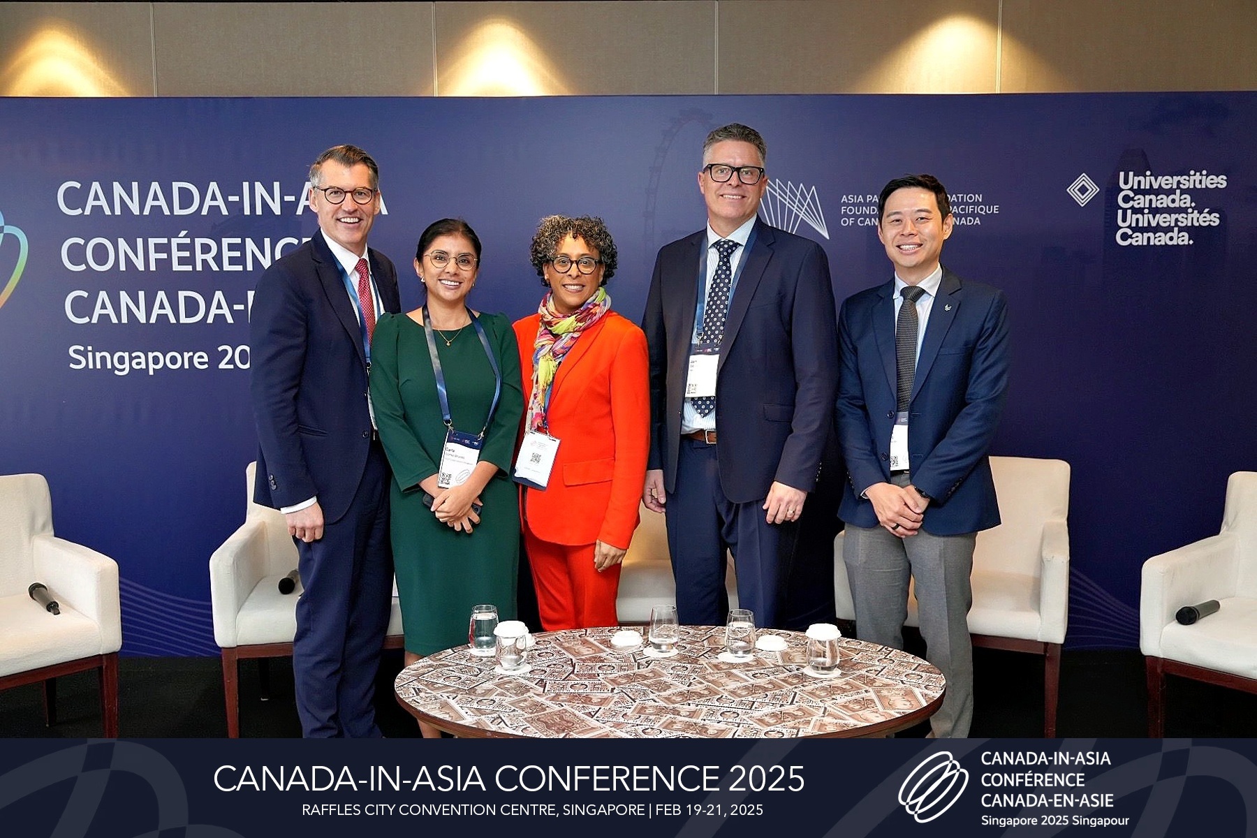 Conférenciers du panel « Promotion de la sécurité alimentaire par l'innovation » à la Conférence Canada-en-Asie 2025 : Robert Hunter (PDG, Protein Industries Canada), Carla Gomez (Centre mondial pour la technologie, l'innovation et le développement durable du PNUD), Justine Hendricks (PDG, Financement agricole Canada), Jeff Barlow (propriétaire, Barlow Farms), John Cheng (fondateur et PDG, Innovate 360)