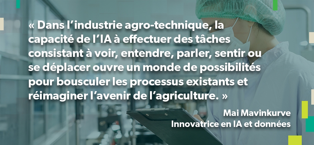 « Dans l’industrie agro-technique, la capacité de l’IA à effectuer des tâches consistant à voir, entendre, parler, sentir ou se déplacer ouvre un monde de possibilités pour bousculer les processus existants et réimaginer l’avenir de l’agriculture, affirme-t-elle. L’IA est encore émergente dans ce domaine. Ainsi, on peut dire que son potentiel est quasi entièrement sous-utilisé. »