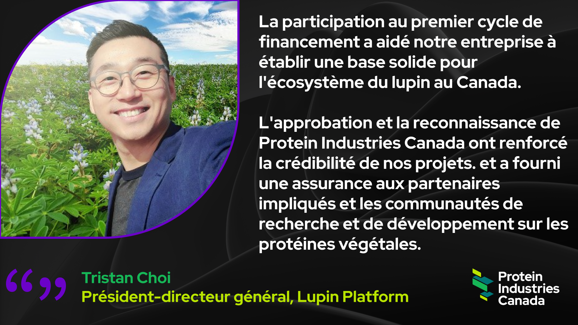 « La participation au premier cycle de financement a aidé notre entreprise à établir une base solide pour l'écosystème du lupin au Canada », a déclaré Tristan Choi, PDG de Lupin Platform Inc. « L'approbation et la reconnaissance de Protein Industries Canada ont renforcé la crédibilité de nos projets. et a fourni une assurance aux partenaires impliqués tels que Farmers Network et les communautés de recherche et de développement sur les protéines végétales."
