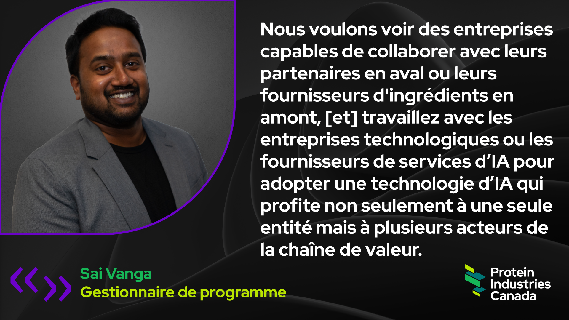 « Nous avons constaté beaucoup d'intérêt de la part des entreprises agricoles de pré-récolte ou primaires, mais je pense que l'apport de nos transformateurs finaux et de nos entreprises de CPG a été un peu plus lent, a déclaré Sai Vanga, responsable du programme de Protein Industries Canada. Certaines entreprises sont encore en train d'apprendre comment l'IA aurait un impact réel sur leur activité et développent une stratégie sur la façon dont elles peuvent inclure l'IA pour obtenir de meilleurs résultats en termes d'efficacité ou de produits ou services qu'elles proposent. »