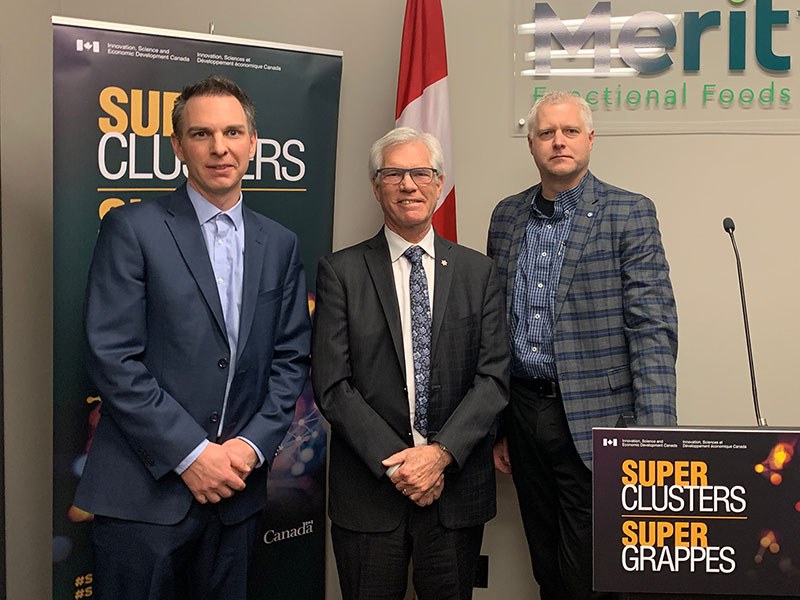 De gauche à droite : Ryan Bracken, co-PDG de Merit Functional Foods, l'honorable Jim Carr, conseiller spécial pour les Prairies, et Bill Greuel lors de l'événement d'annonce de Merit Functional Foods et Pitura Seeds