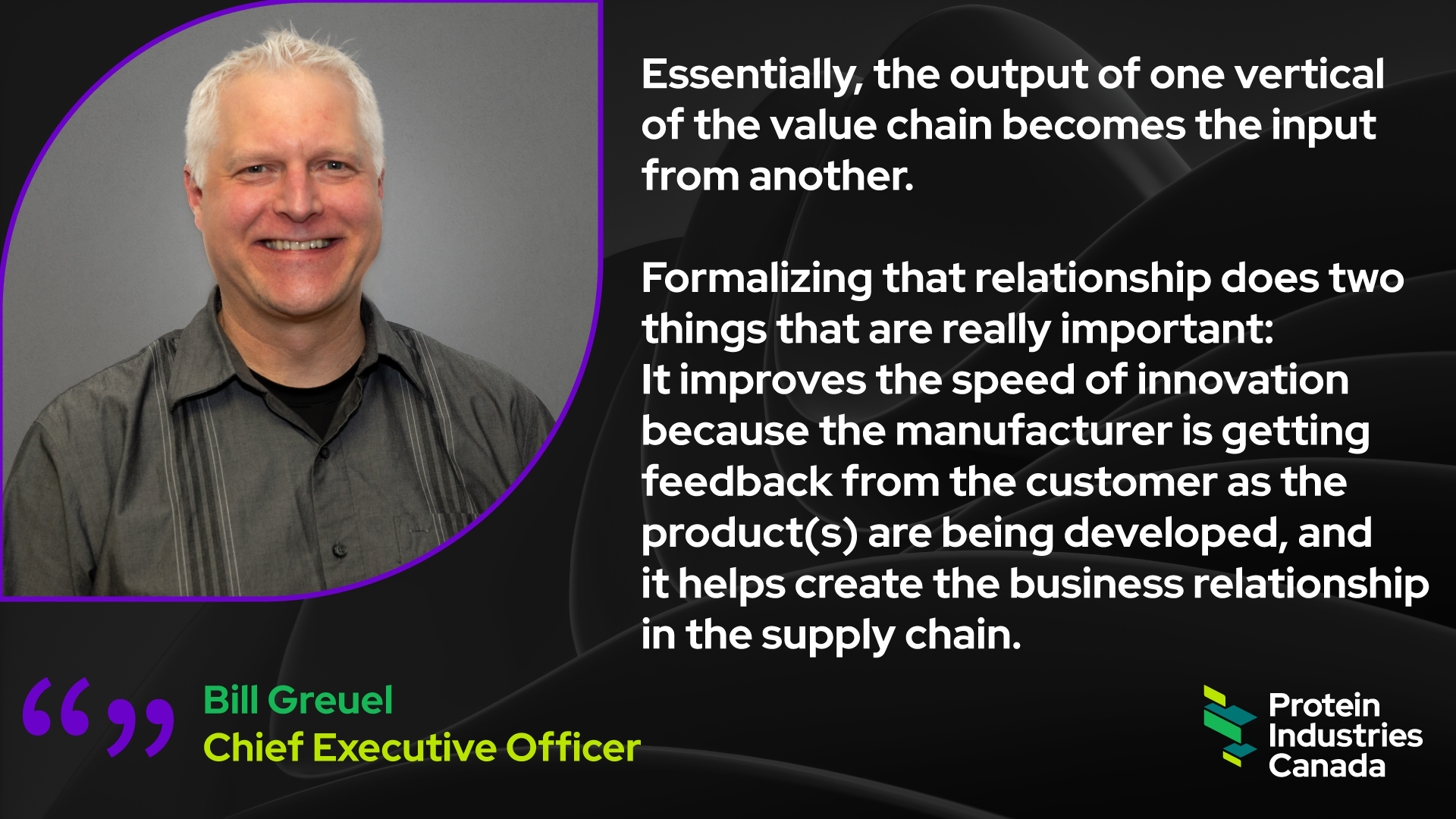 “Essentially, the output of one vertical of the value chain becomes the input from another,” Greuel explained. “Formalizing that relationship does two things that are really important: It improves the speed of innovation because the manufacturer is getting feedback from the customer as the product(s) are being developed and it helps create the business relationship in the supply chain. We’re fortunate here at Protein Industries Canada as we’ve been thinking about the value chain approach to innovation since day one.”
